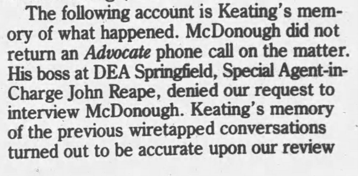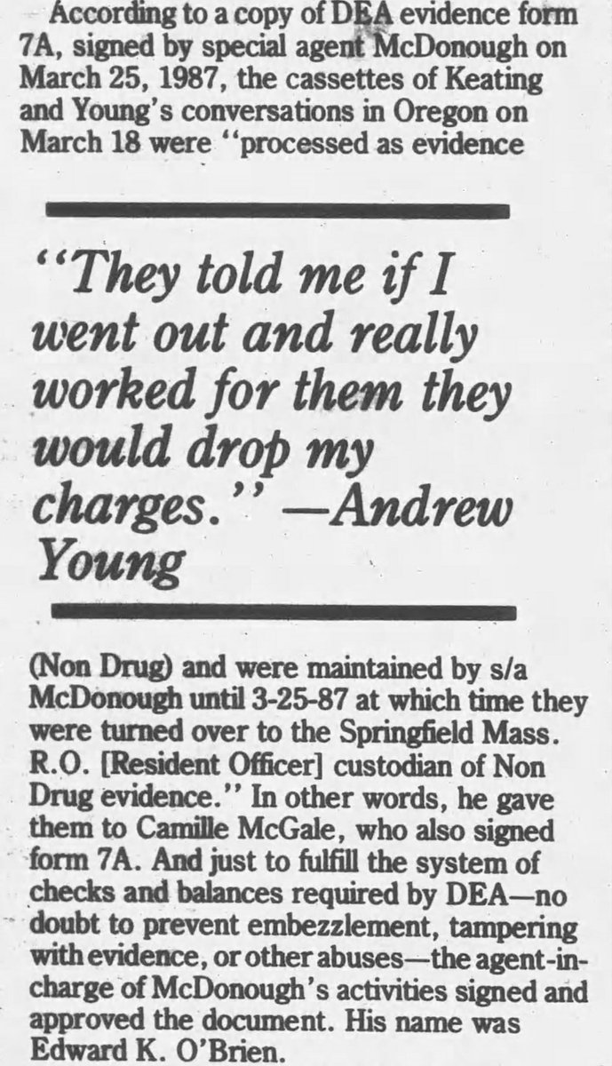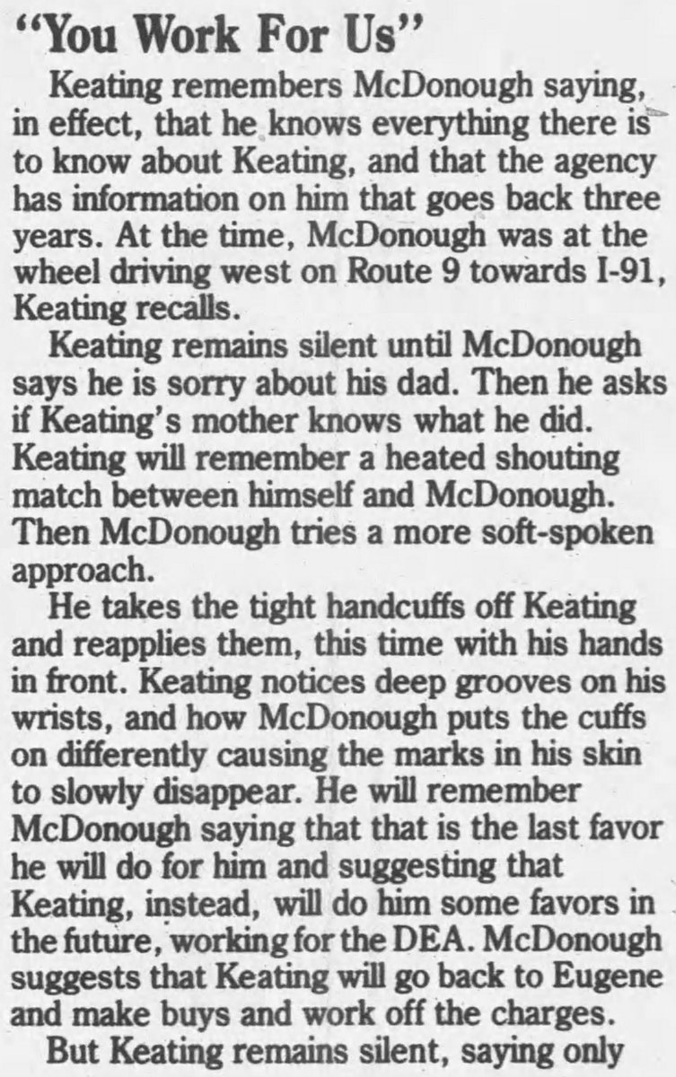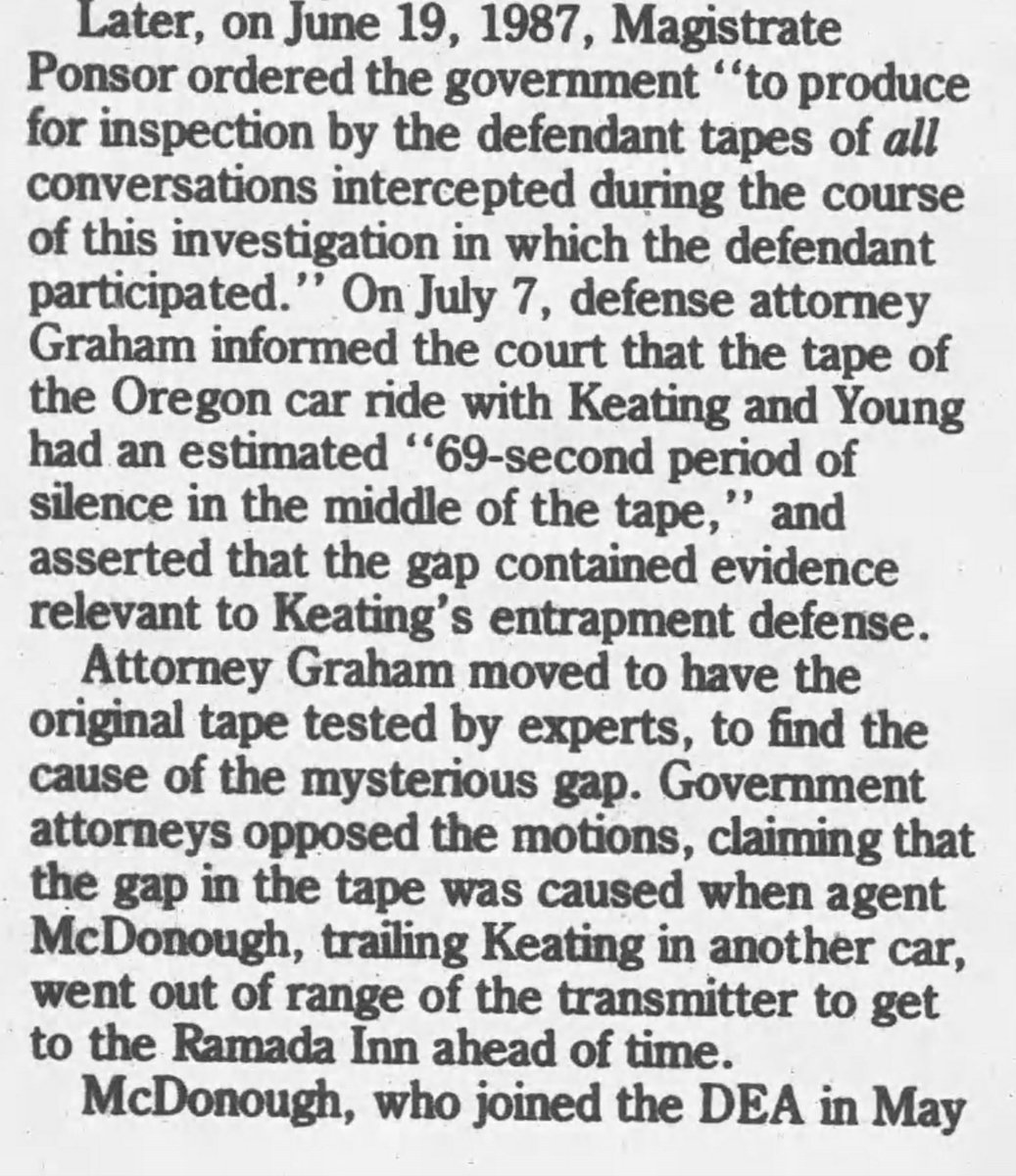 Background: A criminal in Eugene Oregon by the name of Joe Keating was attempting to buy 2500 hits of LSD from a DEA informant in Western Massachusetts named Andrew Young. Sean McDonough working the case with DEA-Oregon used body worn and telephonic wires to record the deals.