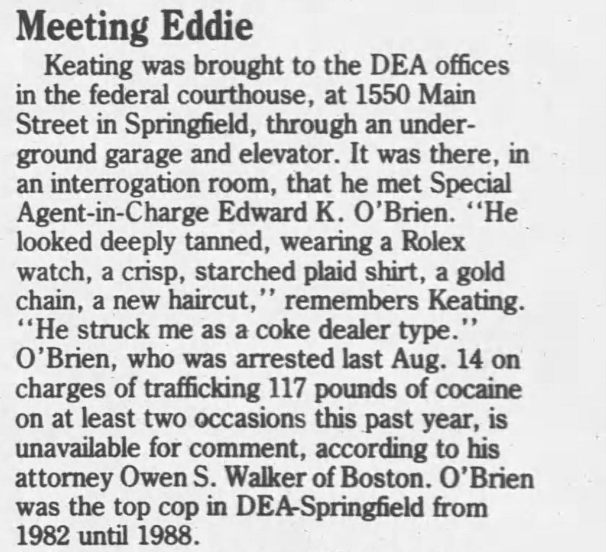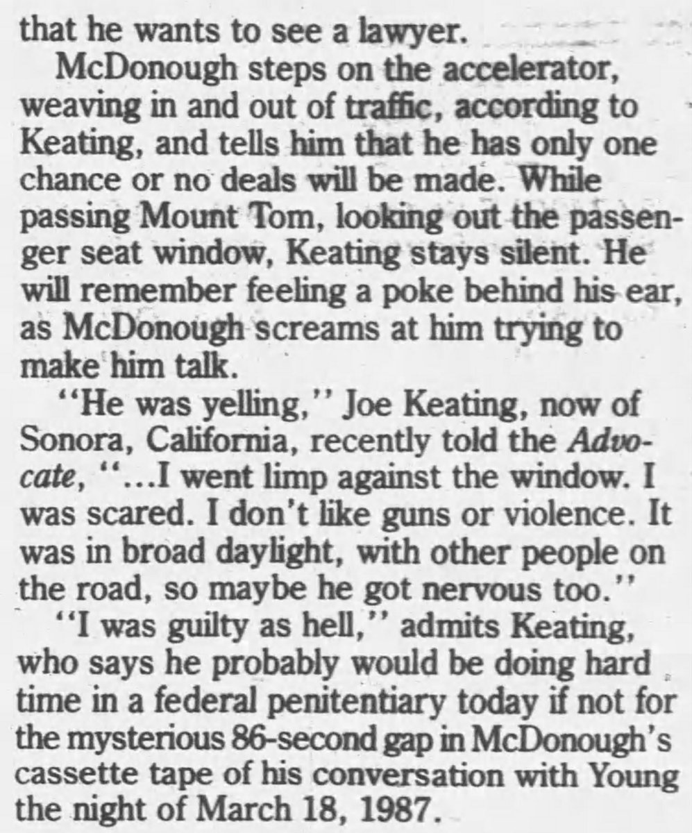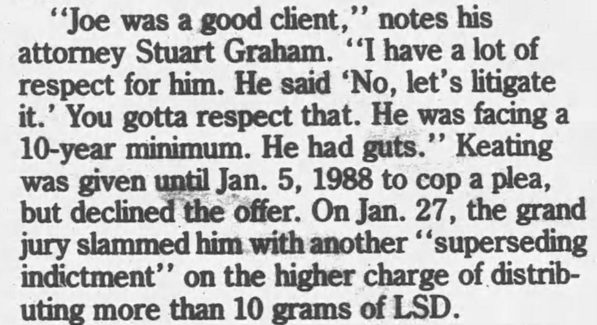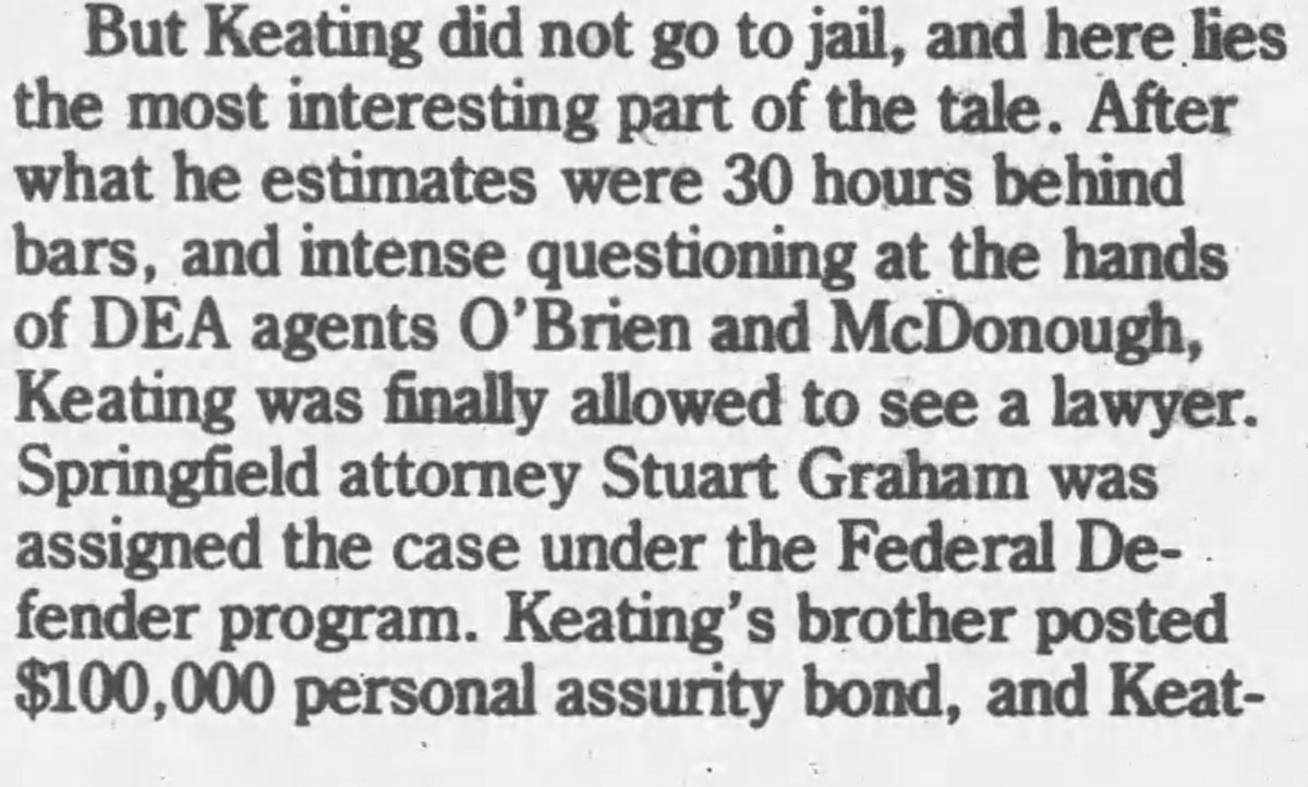 Background: A criminal in Eugene Oregon by the name of Joe Keating was attempting to buy 2500 hits of LSD from a DEA informant in Western Massachusetts named Andrew Young. Sean McDonough working the case with DEA-Oregon used body worn and telephonic wires to record the deals.