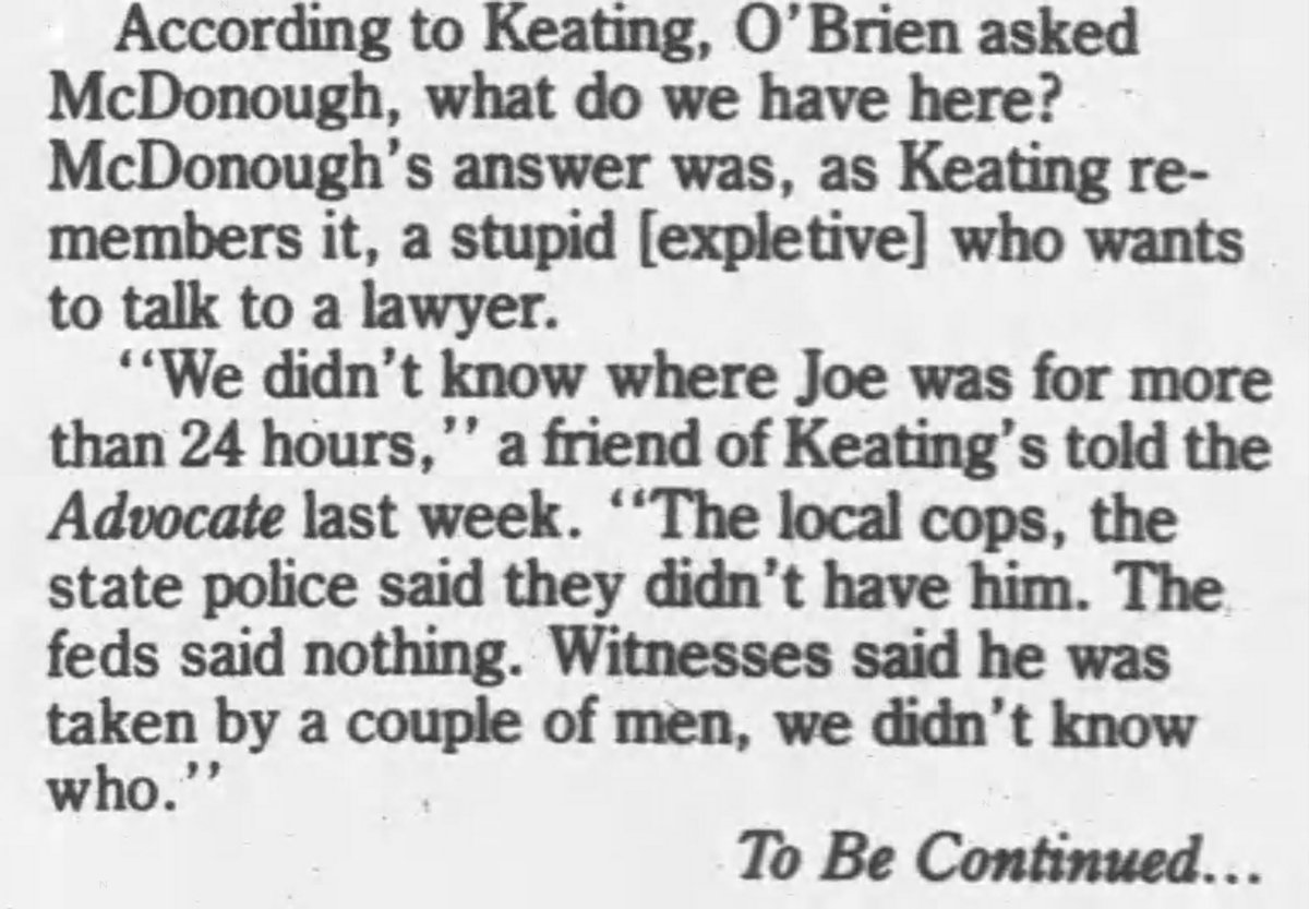 This is an excerpt from another part of the story. They held Keating who requested a lawyer and to invoke his 5th amendment right against self-incrimination to a prolonged custodial interrogation against the law.