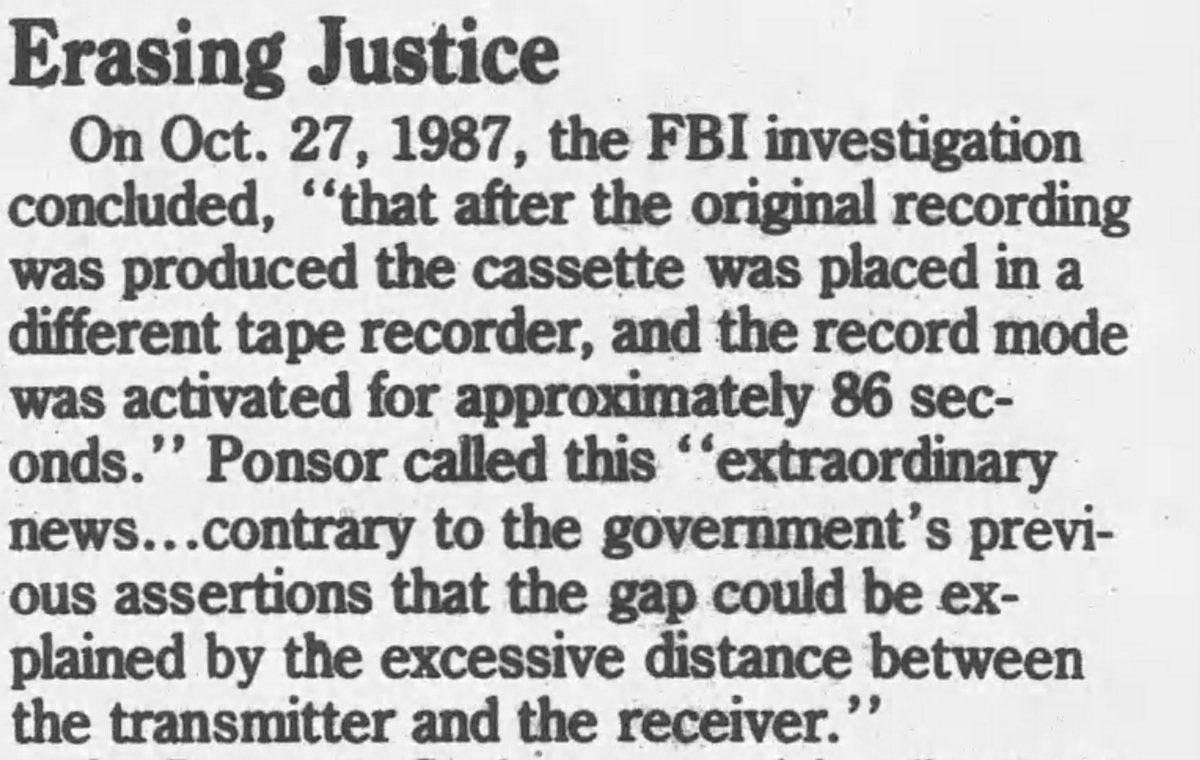 McDonough’s explanation was so far-fetched that despite the government trying to call the defense conspiracy theorists, the Judge allowed the tape to be examined by the FBI to try and determine if McDonough intentionally destroyed evidence. Who wants to guess what they found?