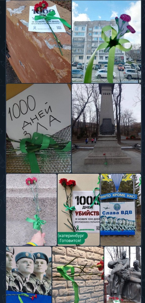 Astra published photos from #Yekaterinburg #Ulyanovsk #Novosibirsk #Perm + #YuzhnoSakhalinsk where people were asked to bring carnations + green ribbons to memorials.