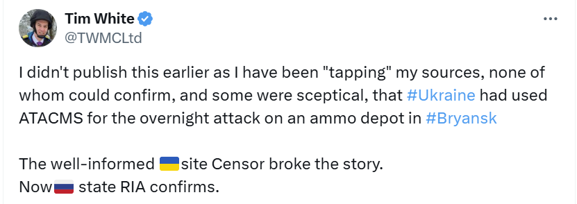 I didn't publish this earlier as I have been "tapping" my sources, none of whom could confirm, and some were sceptical, that #Ukraine had used ATACMS for the overnight attack on an ammo depot in #Bryansk