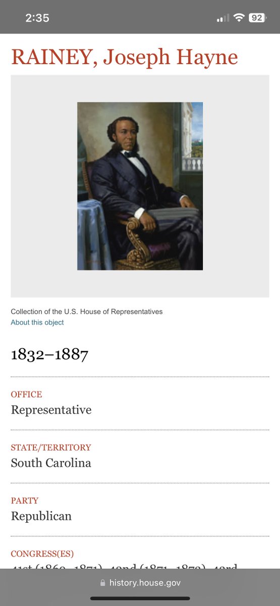 1870 on October 19th Rainey won a special election as a Republican to the 41st United States Congress for SC 01. Seated Dec 12th 1870.