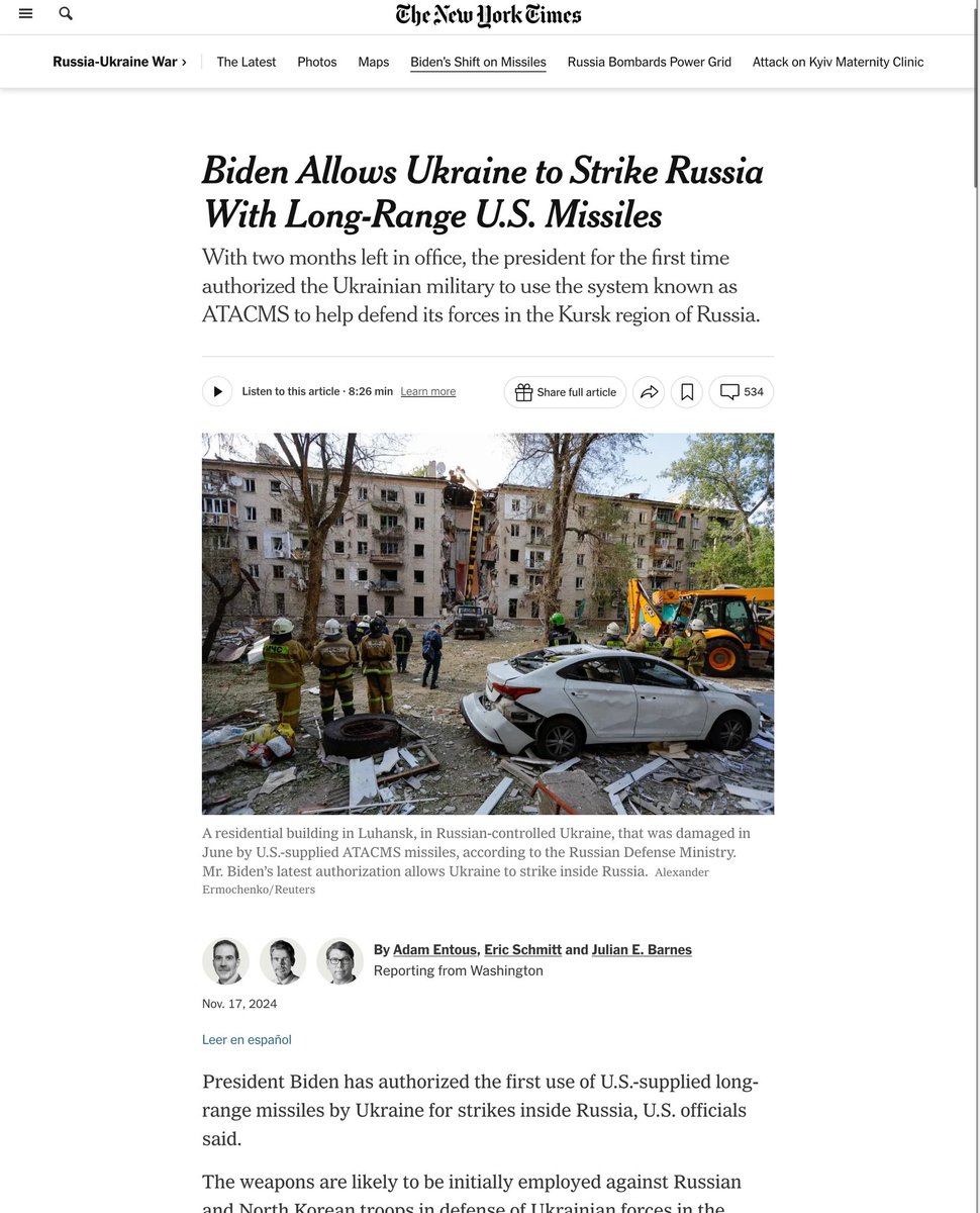 Biden Allows Ukraine to Strike Russia With Long-Range U.S. Missiles