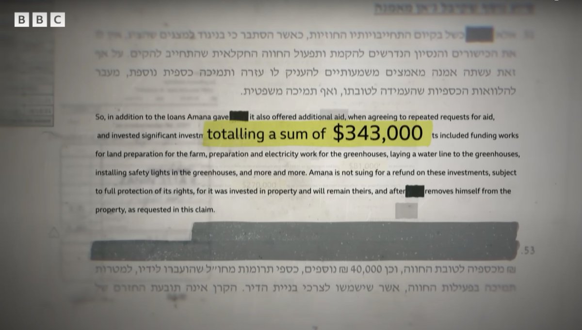 But the US sanctions recognise Amana's less well known activities - something that we investigated for the BBC this year. We revealed multiple cases of Amana loaning hundreds of thousands of dollars to settlers to build illegal 'outposts'.Image