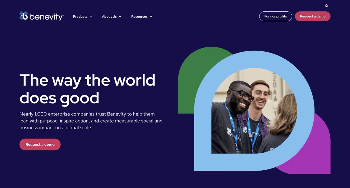 Benevity manages employees' giving to nonprofits before taxes, companies matching employee contributions, employee volunteering, and corporate grants.