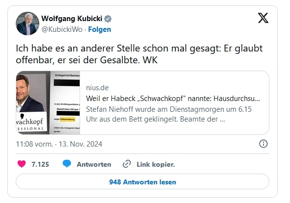 Erwähnenswert ist noch, dass der Niehoff zugerechnete X-Account damit konfrontiert wurde, dass doch im Beschluss von mehr als dem Habeck-Beirag gesprochen wurde, was er mit Nichtwissen bestritt (den genauen Wortlaut müsste ich nachschauen).
