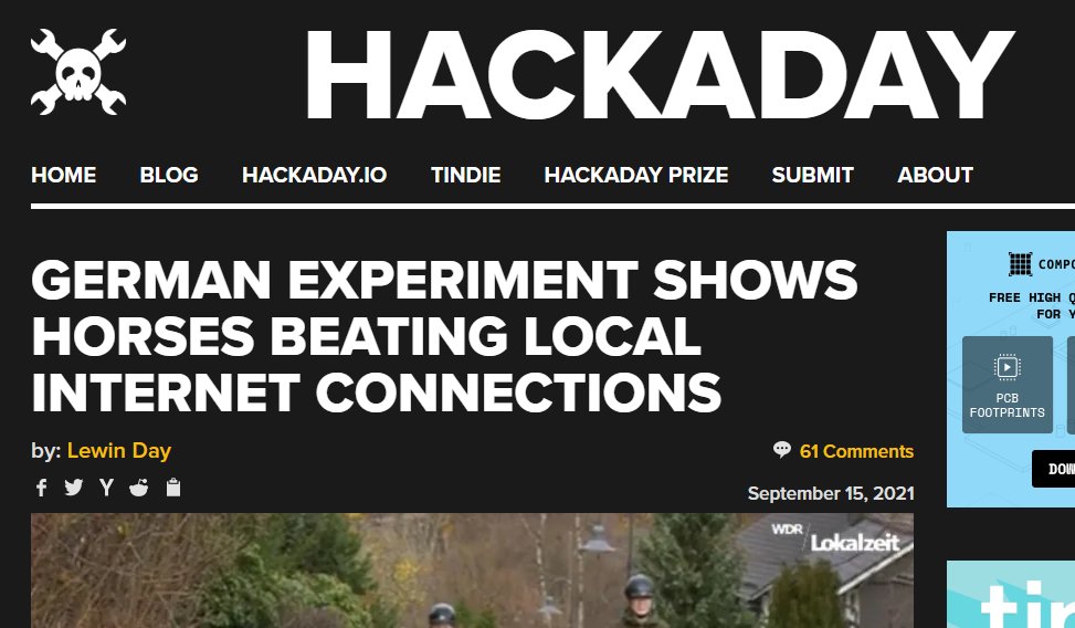 Słynny był też wyścig Internetu z koniem, który zorganizował pewien fotograf w Schmallenberg-Oberkirchen. Otóż miał on do przesłania na odległość 10 kilometrów jakieś 4,5 gigabajta danych. Jednocześnie puścił transfer ze swojego komputera i konia z jeźdźcem wiozącym płytę DVD z zapisanymi danymi. Koń wygrał ten wyścig zdecydowanie. Kiedy dojechał do celu, transfer przez Internet był dopiero na 61 procentach.