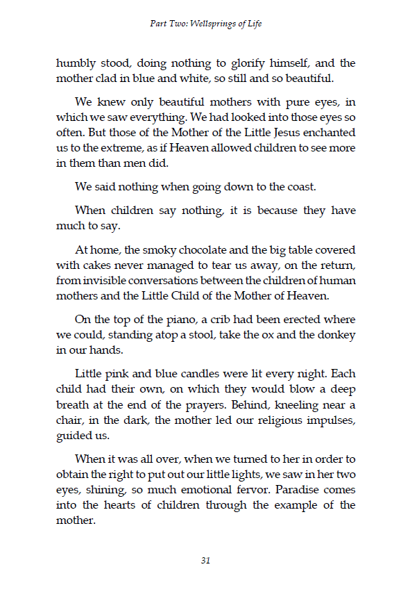 “We knew only beautiful mothers with pure eyes, in which we saw everything. We had looked into those eyes so often. But those of the Mother of the Little Jesus enchanted us to the extreme, as if Heaven allowed children to see more in them than men did.