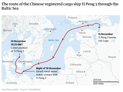 Le Danemark avait auparavant déclaré qu'un navire de guerre se trouvait à proximité d'un cargo chinois, le Yi Peng 3, ancré dans la Baltique entre la Suède et le Danemark . Le navire a été suivi après avoir croisé les deux câbles, dimanche et lundi, au moment où chacun d'eux aurait été sectionné lors d'une attaque malveillante présumée.