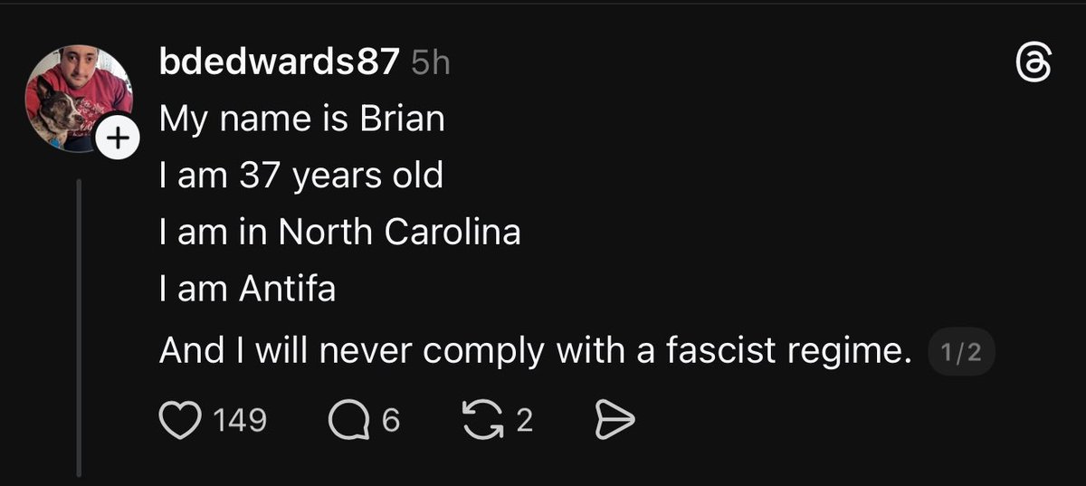 3/ On Saturday, @MostlyPeacefull exposed that Edwards had made a post stating "I am antifa" and that he would "never comply with a fascist regime," also referring to President Trump as a "piece of s___"