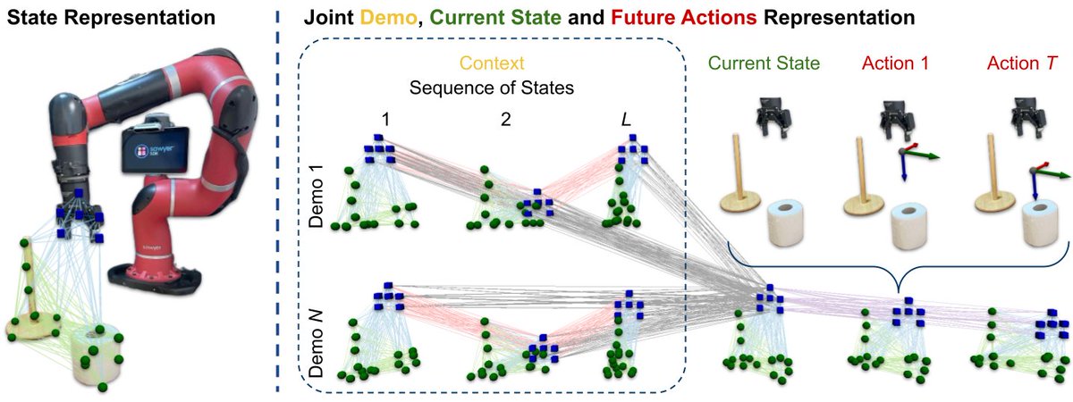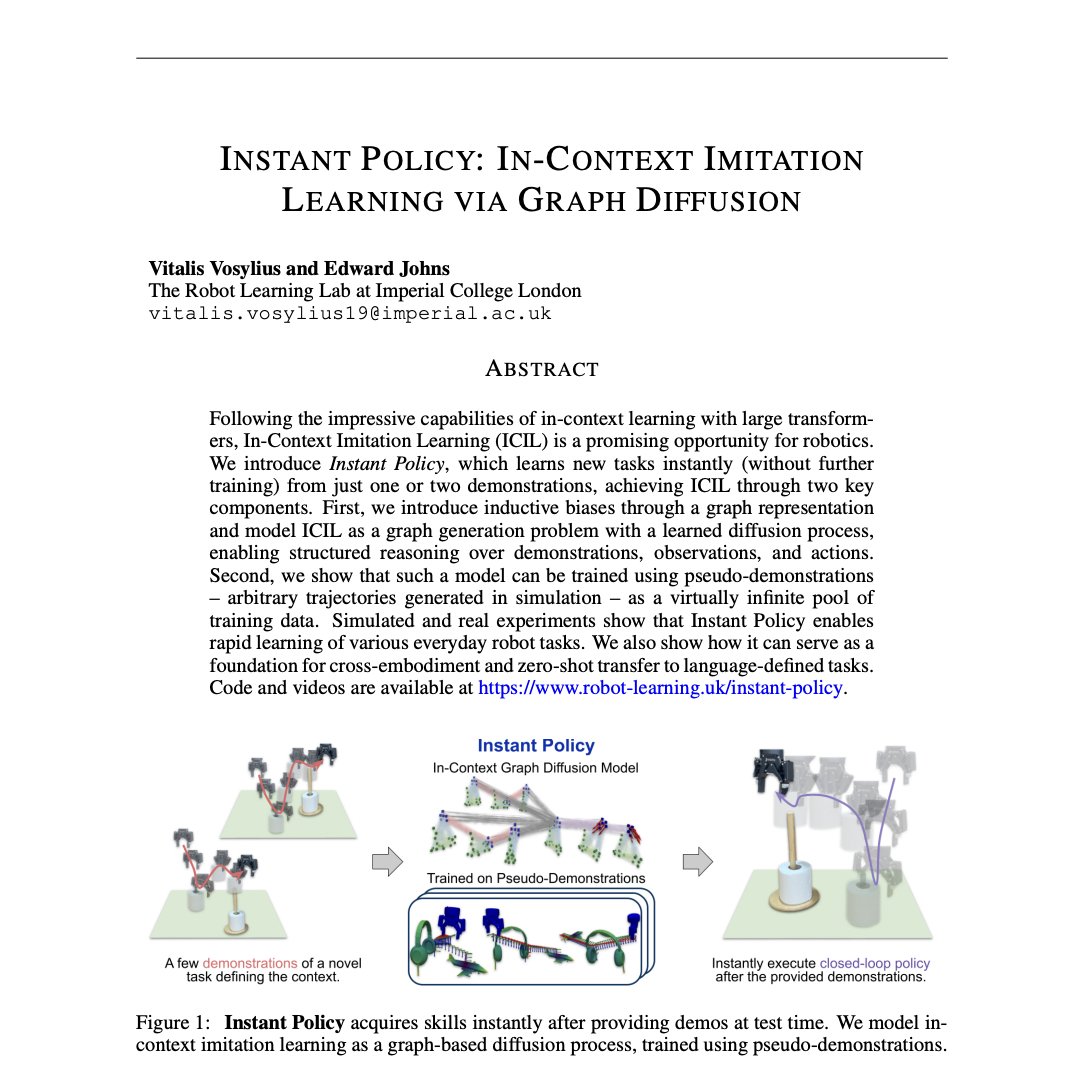 Achieving this in robotics is very exciting: with Instant Policy, we can now provide one or a few demonstrations (the "context"), and the robot instantly learns a closed-loop policy for that task, which it can then immediately perform.