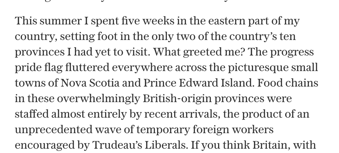 After some perfunctory criticisms of Justin Trudeau's vision of a post-national country and the apparent chaos that has wrought (we'll get back to that), he talks about a recent holiday to Atlantic Canada.