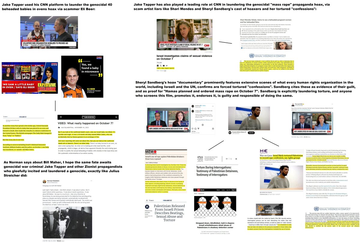 How about the Western media class that fabricated genocidal atrocity propaganda enabling this mass rape and slaughter to continue to this very day, including the New York Times' Joseph Kahn, Ronen Bergman, Patrick Kingsley, CNN's Jake Tapper and Dana Bash, the Washington Post's Shira Rubin, the Guardian's Bethan McKernan, the AP's Josef Federman, the BBC's Lucy Manning and Ido Vock?