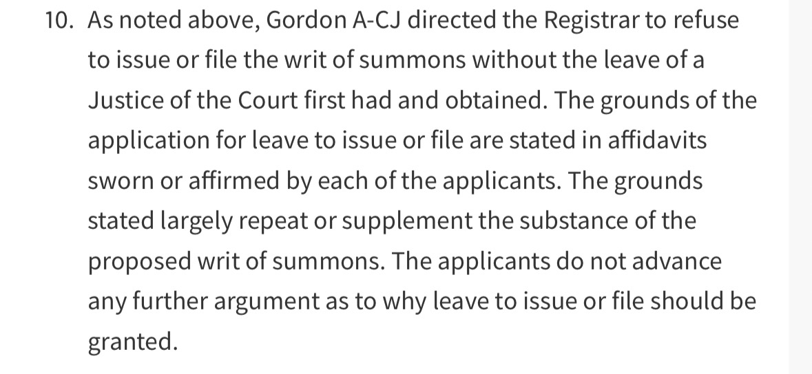 9. The Court held that it was plain on the face of the doctors’ application that it was "confused or manifestly untenable". The Court held that the claim described would be an abuse of process if the document was filed
