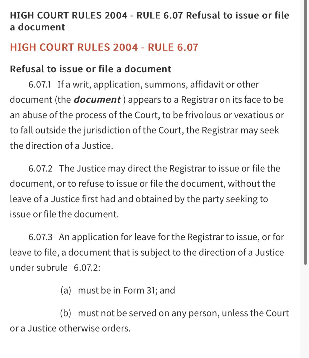 6. When the doctors tried to file their case w/ the High Court, it was rejected by the Court pursuant to rule 6.07.02 of the High Court Rules. This rule allows a justice to direct the Registrar to refuse to allow someone to file a document (cont)