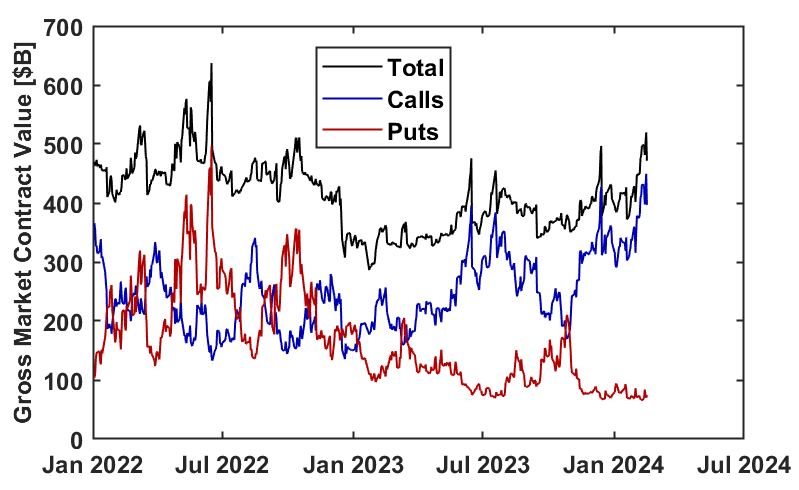 First we have an update on options contract values on the chain. Similar story, most of the value is in calls. Puts continue to be sold to scavenge income. But compare Feb to spike in Dec. In Dec, lots of contract value dropped off at OPEX. In Feb very little did.