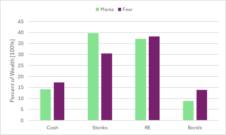 In times when exuberance is low, People want to hold more cash relative to stocks + RE. When mania is raging, people don't want to hold cash and bonds.