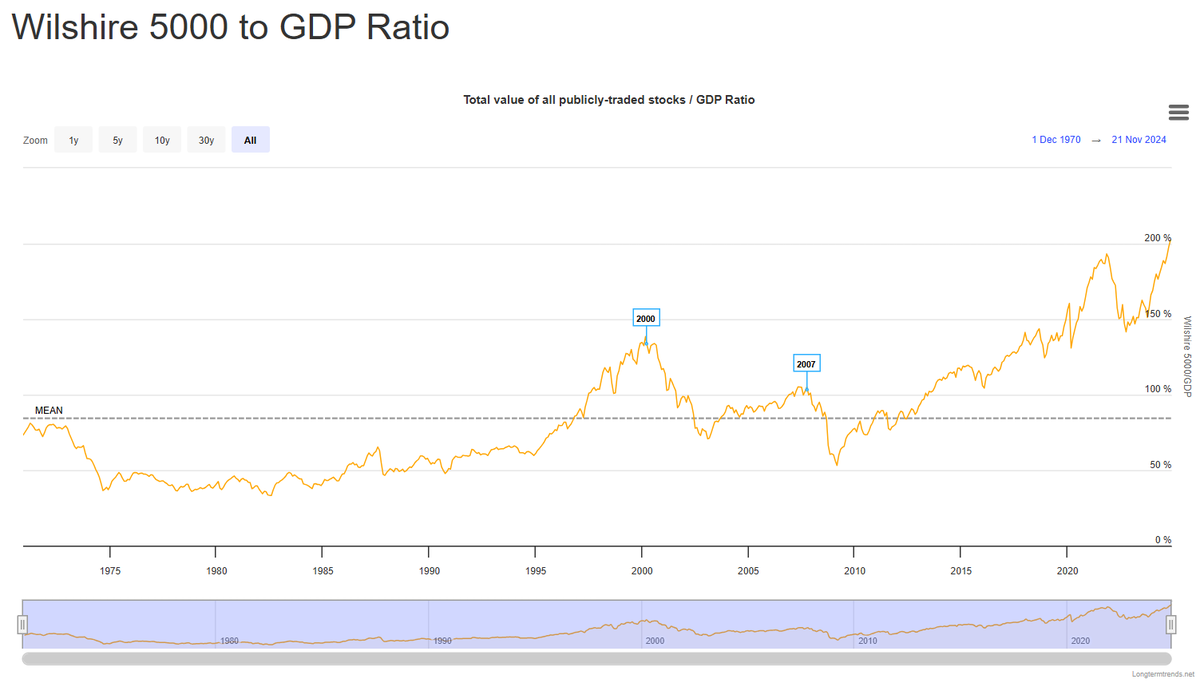 During the height of the dot com bubble, the market cap of the stock market hit 300% of the money supply. Today we are very close to the same level. But money today is much less productive than in the past, so looking at market cap to GDP, the "Buffett Indicator," shows an ATH.