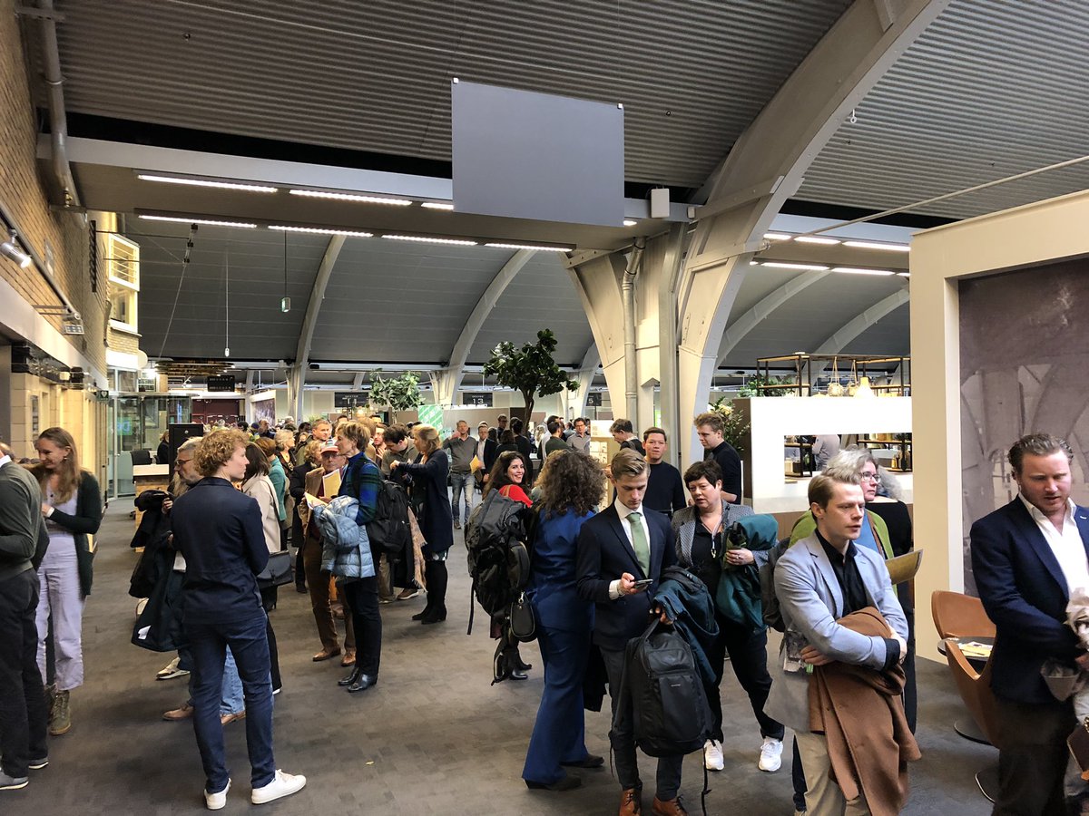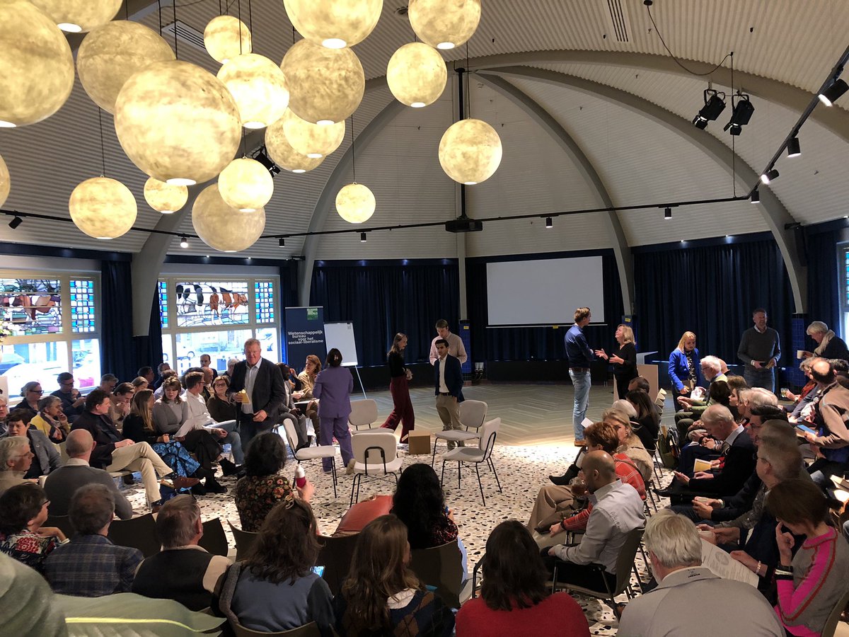 Er is een heel creatief gespreksformat bedacht. Ik vraag me nu al af of dit werkt. Je kunt bij het gesprek gaan zitten als je iets toe te voegen hebt. Er zijn hier veel meer mensen dan verwacht. Ik denk wel ruim honderd.