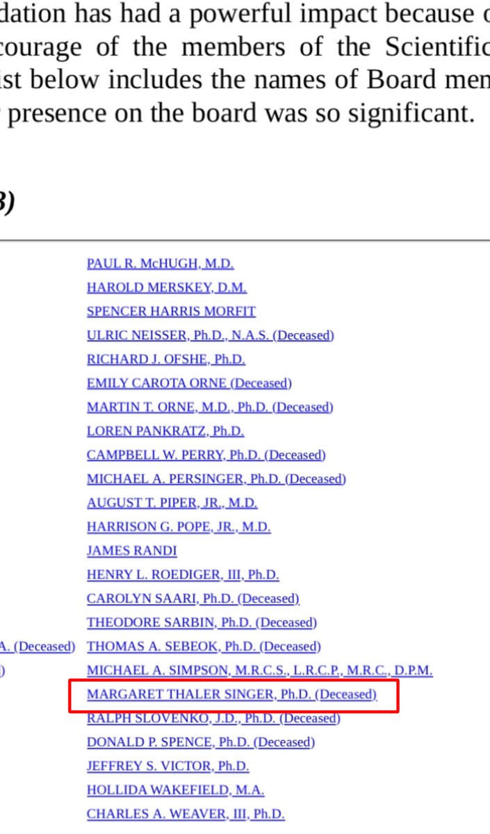 Founding member of The False Memory Syndrome Foundation. Which also gave her a spot on the FMSF Scientific Advisory Board.
