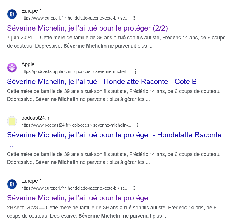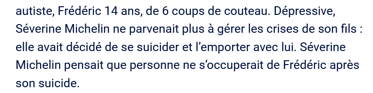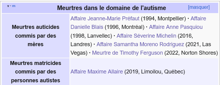 Quelques sources au sujet des auticides maternels (= meurtres parentaux d'enfants autistes), dont Samuel le Bihan prétend qu'ils se produisent une fois tous les dix ans.