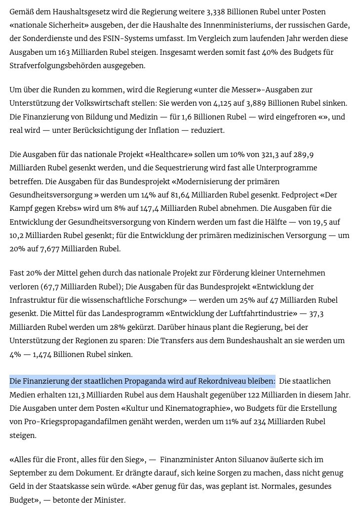 Aber es gibt einen zweiten Posten im russischen Staatshaushalt, der immer gut finanziert ist: