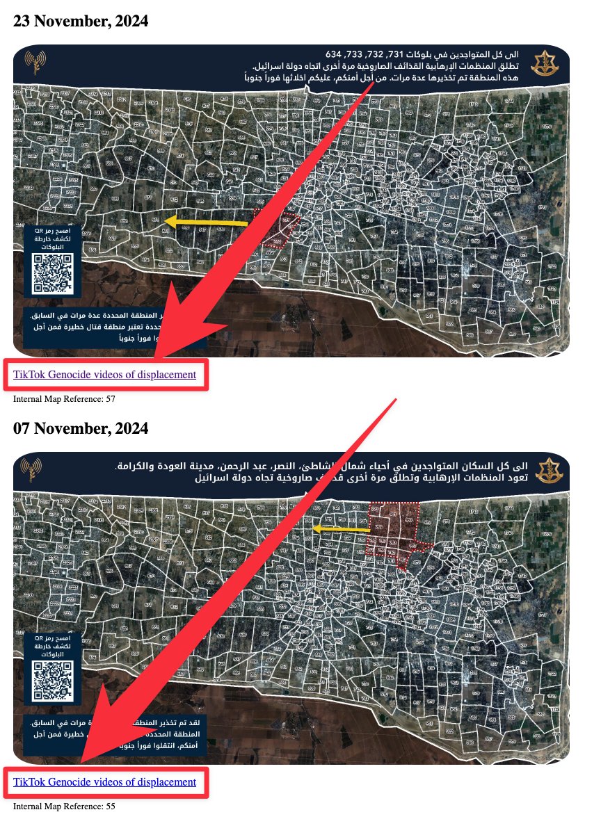 10/ Many of our other archival platforms have integration with TikTokGenocide.com. For example, our archival project focused on forced displacement GazaMaps.com, often includes links to videos that stem for a *particular* forced displacement order.