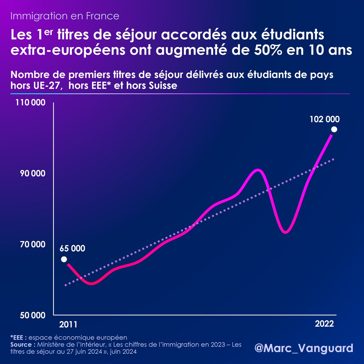 1⃣ Depuis 2022, plus de 100 000 titres de séjour étudiants sont accordés chaque année, contre 65 000 en 2011, une hausse de +50%.
