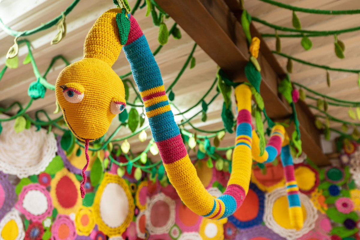 E não pense que somente a parte de fora foi revestida com crochê. TUDO, tudo mesmo, dentro do prédio também recebeu a decoração. Da parede ao teto: