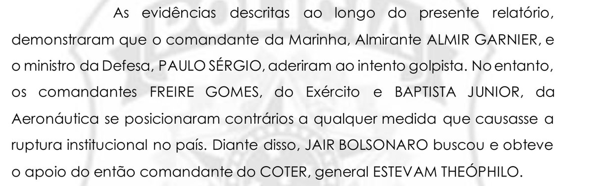 “Os elementos de prova obtidos ao longo da investigação demonstram de forma inequívoca que o então presidente da República, JAIR MESSIAS BOLSONARO, planejou, atuou e teve o domínio de forma direta e efetiva dos atos executórios realizados pela organização criminosa que objetivava a concretização de um Golpe de Estado e da Abolição do Estado Democrático de Direito, fato que não se consumou em razão de circunstâncias alheias à sua vontade.”