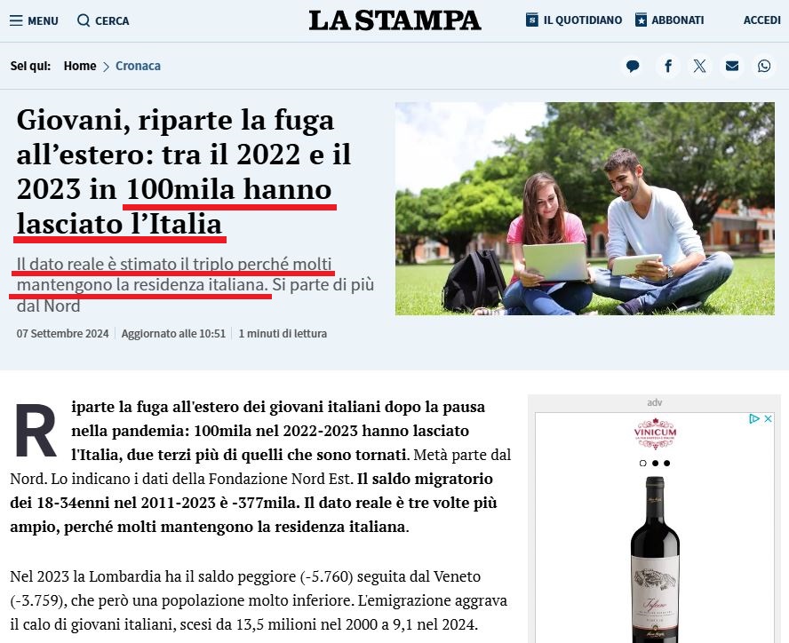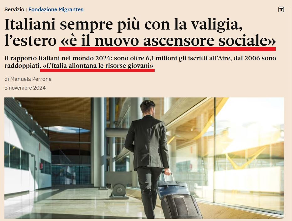 tristissima dissoluzione del modello italiano, che forma talenti, li sfrutta, li fa scappare via, ma per inefficienze storiche, produttive, statali, private, culturali, politiche, etc, ha bisogno di manodopera low-cost. Che fra l'altro rischia di non trovare. Perché il