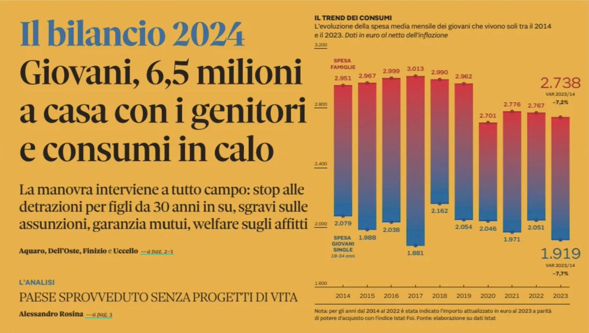 ammazzerà le loro prospettive, i loro sogni o banalmente il loro stipendio. Quelli che rimangono, o vivono nelle poche nicchie fortunate, o si aggrappano alla famiglia. Poi ovviamente le autorità si stupiscono dei "consumi in calo" e partoriscono manovre totalmente