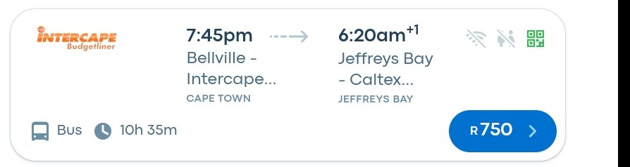 ticket to Cape Town. We took a chance and called Intercape promising to pay for a return trip at the Cape Town station before the bus arrived in Cape Town.The mom left Jeffreys Bay on an Intercape bus last night at 23h20 and arrived in Cape Town at 09h10. The cost for the return