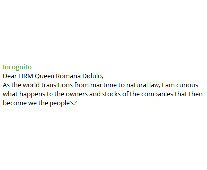 @RebeccaO1340 And Incognito wants to know about corporate stock. Is Romana going to give it to everyone for free?