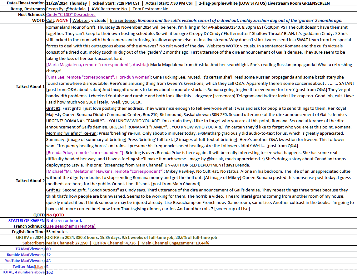 @RebeccaO1340 Thursday 28 November 2024. The cult did 55 minutes of standard cult drivel. Brenda was on, Gail remains dead. Mikey Hawkey must be sending them money still because they still have him on even though they obviously hate him. Thanks to @SMetharp @Mugginstoo @Be4rdedW4rrior!