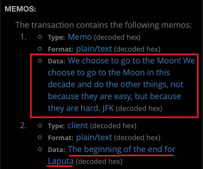 Ripples Escrow memo "The end of Laputa" translates "the end of the whore". <> Whore of babylon <> evil place <> cabal controlled financial system.