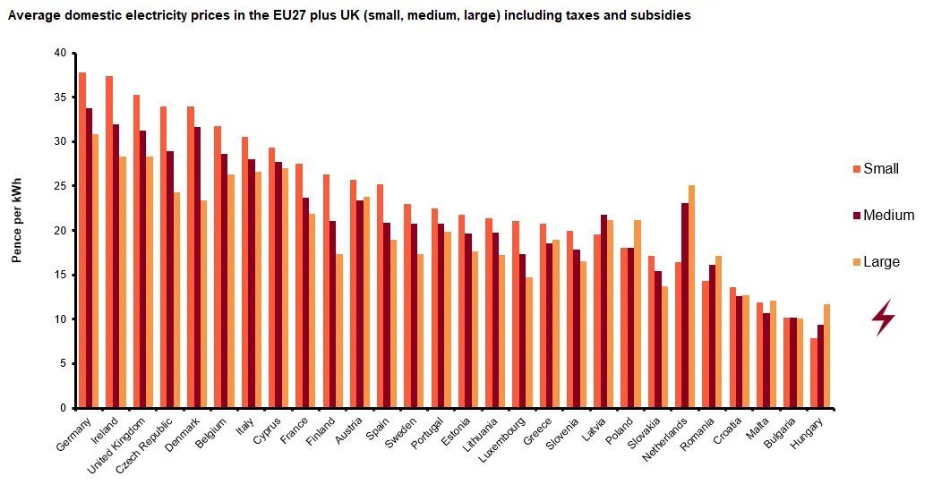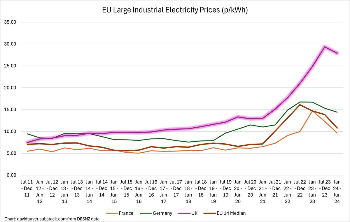 New data came out yesterday comparing energy prices across Europe for Jan-Jun 2024. The UK has by far the highest industrial electricity prices in Europe. This thread explores why that might be and how we fare in domestic markets too. (1/n)