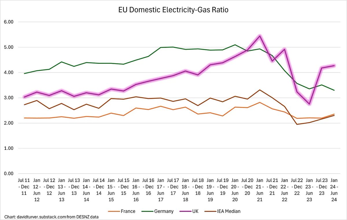 Domestic electricity costs >4X domestic gas, whereas the EU14 median for the ratio is just over 2. Again, it's not gas driving UK electricity prices (7/n)