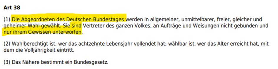 Widerlegung: In Artikel 38 Absatz 1 Grundgesetz steht, dass Abgeordnete nicht an Aufträge und Weisungen gebunden sind. Das freie Mandat des Abgeordneten ist ein Grundpfeiler unserer Demokratie. Es steht somit im Widerspruch zum Prinzip von kommunistischen Räterepubliken, in der Abgeordnete im Parlament bei Abstimmungen an Weisungen gebunden sind.