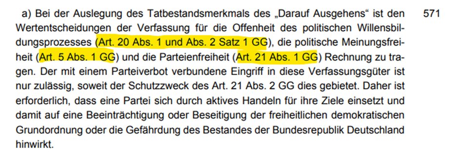 Widerlegung: Im Urteil zum 2. NPD-Verbotsverfahren schreibt Karlsruhe, dass bei der Auslegung des Begriffs „Darauf Ausgehen“ die Grundrechte auf Meinungsfreiheit und Parteienfreiheit berücksichtigt werden müssen. Für die Gutachter sind elementare Grundrechte unserer Demokratie offenbar „keine allzu hohen Anforderungen“!