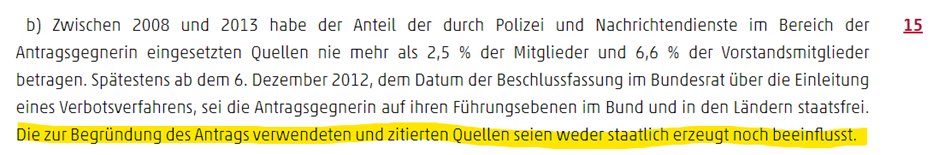 Widerlegung: Das Bundesverfassungsgericht hatte das erste NDP-Verbotsverfahren im Jahr 2003 eingestellt. Denn die Nationaldemokraten waren derart mit Agenten und V-Leuten der Geheimdienste durchsetzt, dass Karlsruhe die NPD in Teilen als verlängerten Arm des Staates ansah. In einem Parteiverbotsverfahren gilt daher das Prinzip der „Quellenfreiheit“: War beispielsweise bei der Erstellung einer Pressemitteilung ein V-Mann oder Agent beteiligt, darf diese Quelle in einem Parteiverbotsverfahren vor dem Bundesverfassungsgericht nicht verwendet werden.