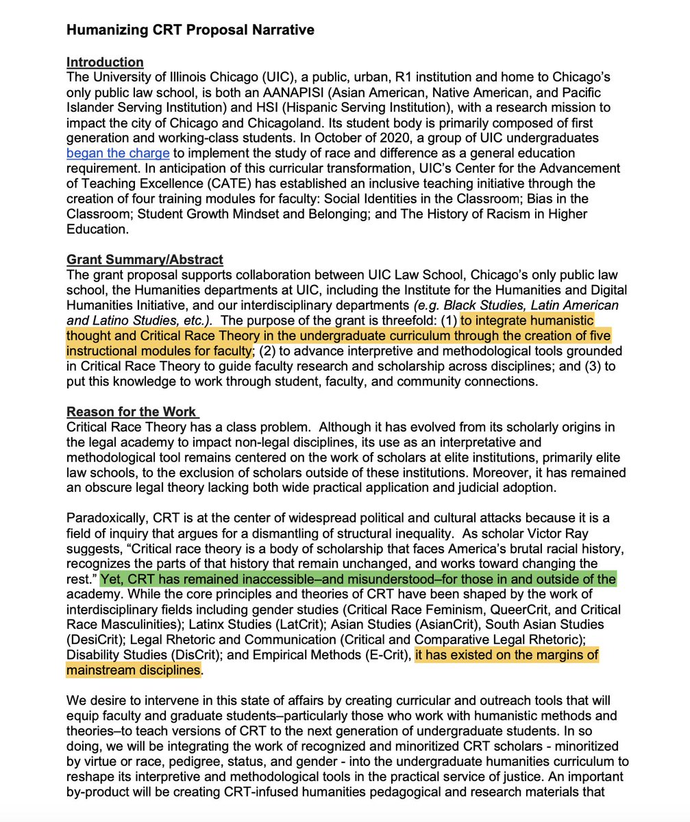 "Humanizing CRT," a $500k project at University of Illinois Chicago, seeks to "integrate... Critical Race Theory in the undergraduate curriculum."