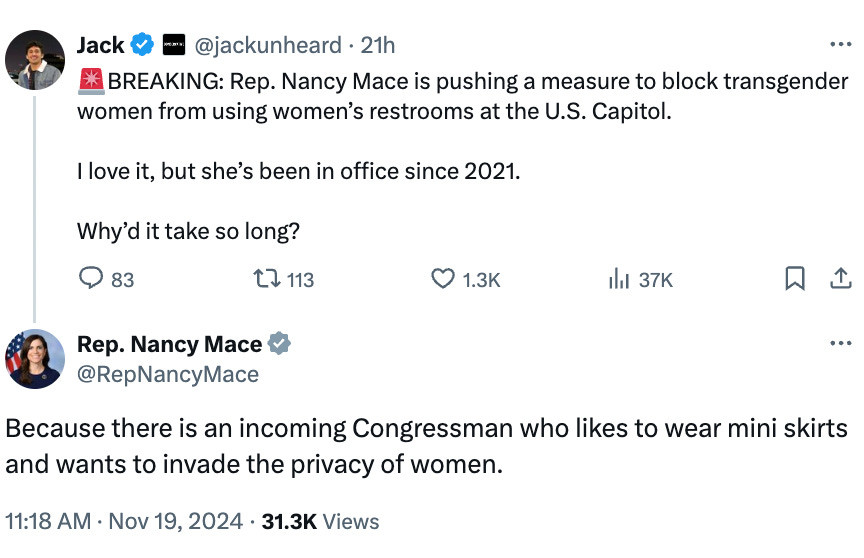 3. Today, Mace has abandoned her support of "transgender equality." Her current position appears to be that trans people do not exist. Mace described McBride as "an incoming Congressman who likes to wear mini skirts and wants to invade the privacy of women"