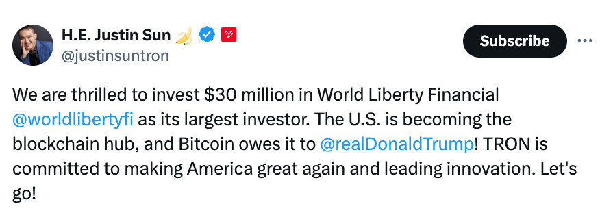 2. On November 25, Sun purchased $30 million in crypto tokens from World Liberty Financial, a new crypto venture backed by Trump.