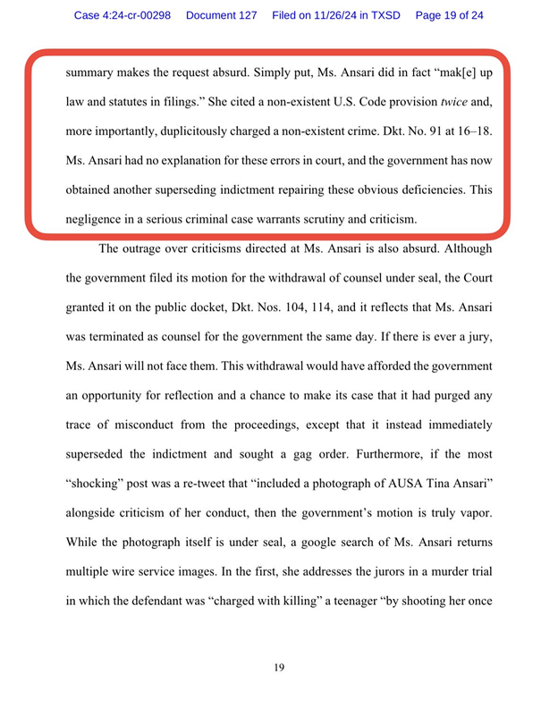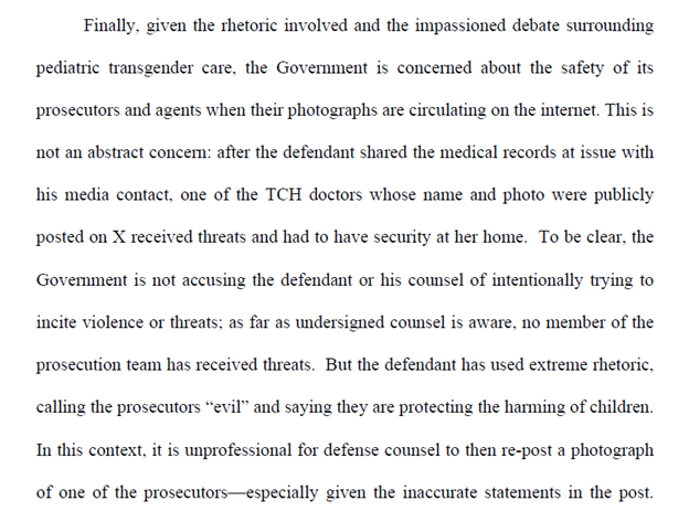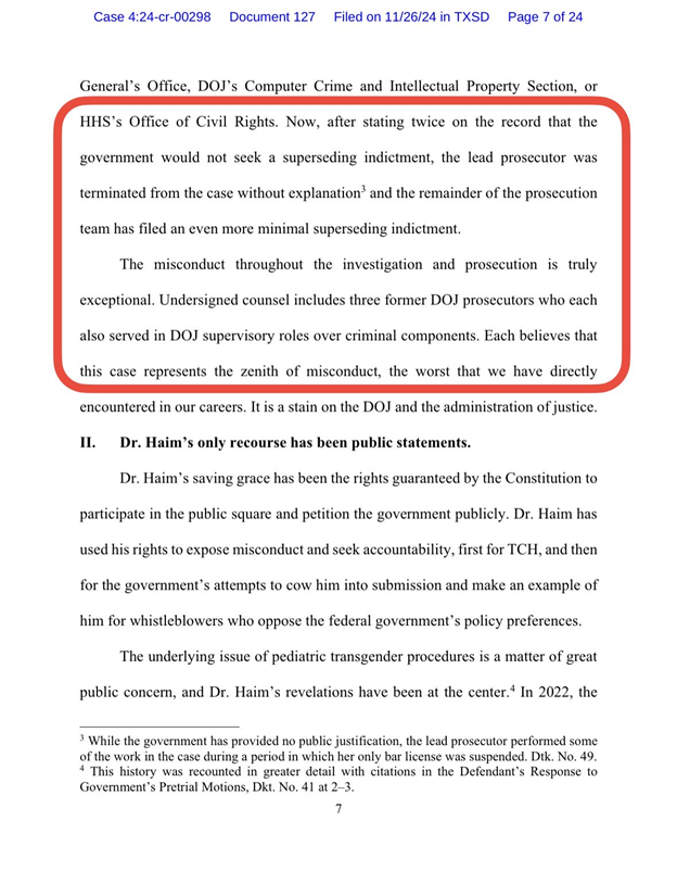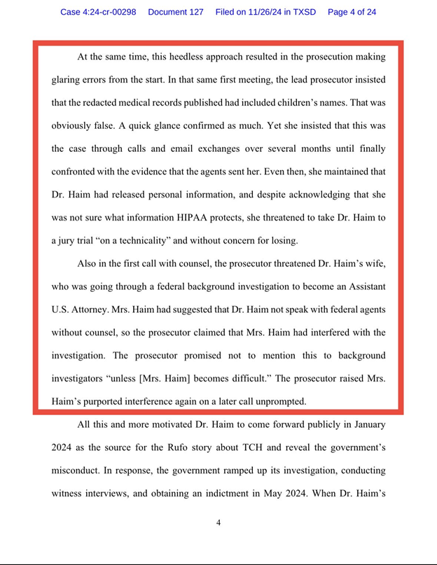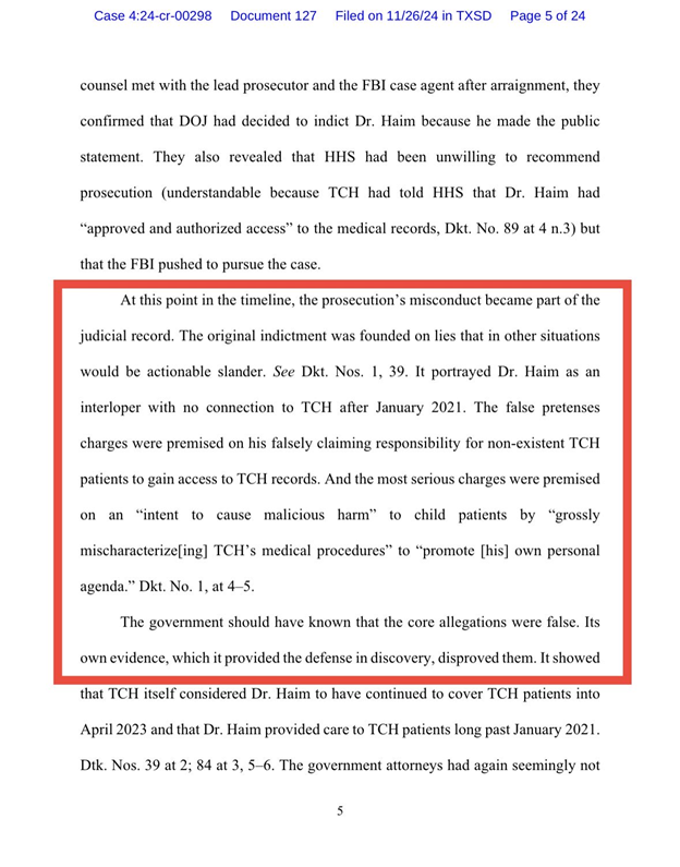 4/ While the government attempts to identify “inaccuracies and mischaracterizations,” it is merely projecting its own propensity to confuse the truth for lies. One of the very first examples is that the government’s decision to prosecute Dr. Haim for coming forward publicly was not wrong because Dr. Haim “publicly admitted he sourced the records.” Of course, the prosecutors who state this don’t know why the former lead prosecutor indicted Dr. Haim or why she said she did because they weren’t on the case. But the prosecution also has a surprise in store—Dr. Haim never admitted to sourcing the records. Instead, he admitted to revealing the deception of Texas Children’s Hospital, which is First Amendment-protected activity. The new prosecution should be wary when trampling constitutional rights. The former lead prosecutor made clear that Dr. Haim’s real crime was speaking out to the media the first time. And the prosecution also sought to muzzle Dr. Haim at trial until the holes in the first indictment derailed those plans.