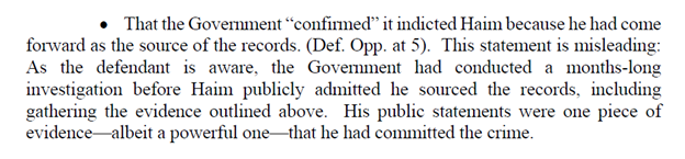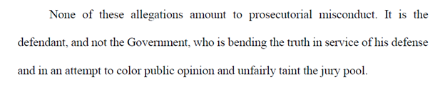 6/ The prosecution asserts that there is no prosecutorial misconduct at all. It is unclear if the new prosecutors are excluding the egregious misconduct of the lead prosecutor, but even the things that have occurred on their watch are reprehensible. They are, after all, on their third indictment because they missed serious errors in the last two, and their first order of business once they dropped the lead prosecutor was to seek a gag order to protect themselves from criticism. Dr. Haim and his counsel have not sought to “unfairly taint the jury pool,” they have sought to fairly “color public opinion” to hold the government accountable for its abuses.