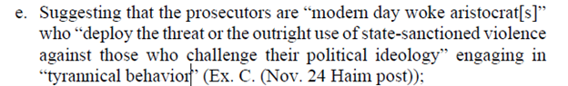 8/ Also like in previous censorship campaigns, the government attempts to use safety concerns to shut down debate. It suggests that the “extreme rhetoric” could harm the career public prosecutors and federal agents who put felons away for a living, even though they have received no threats. Yet the hypocrisy is worse than that. One X post the government complains about is a post by Dr. Haim calling the prosecutors modern day woke aristocrats. But the government omits the context—he was skewering them for the motion for the gag order because the government tried to justify the gag order due to “online bullying” when the prosecution can send armed agents and strip someone of their rights by just an accusation. Now even commenting on the ridiculousness of the government’s censorship attempt is enough to justify censorship in the government’s eyes.