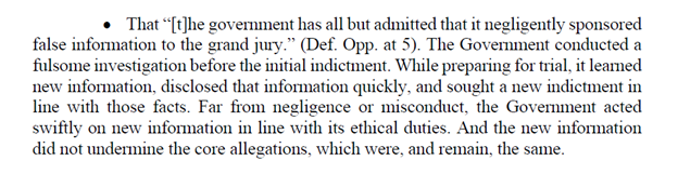 5/ The prosecution also denies that it was at least negligent in sponsoring false information to the first grand jury for the first indictment, which painted Dr. Haim as an interloper who sought to harm TCH patients when he had nothing to do with TCH. Yet records proving that this was false were in the government’s own files. They simply ignored that information and went with the first witness that told them what they wanted to hear. Is that not negligent?