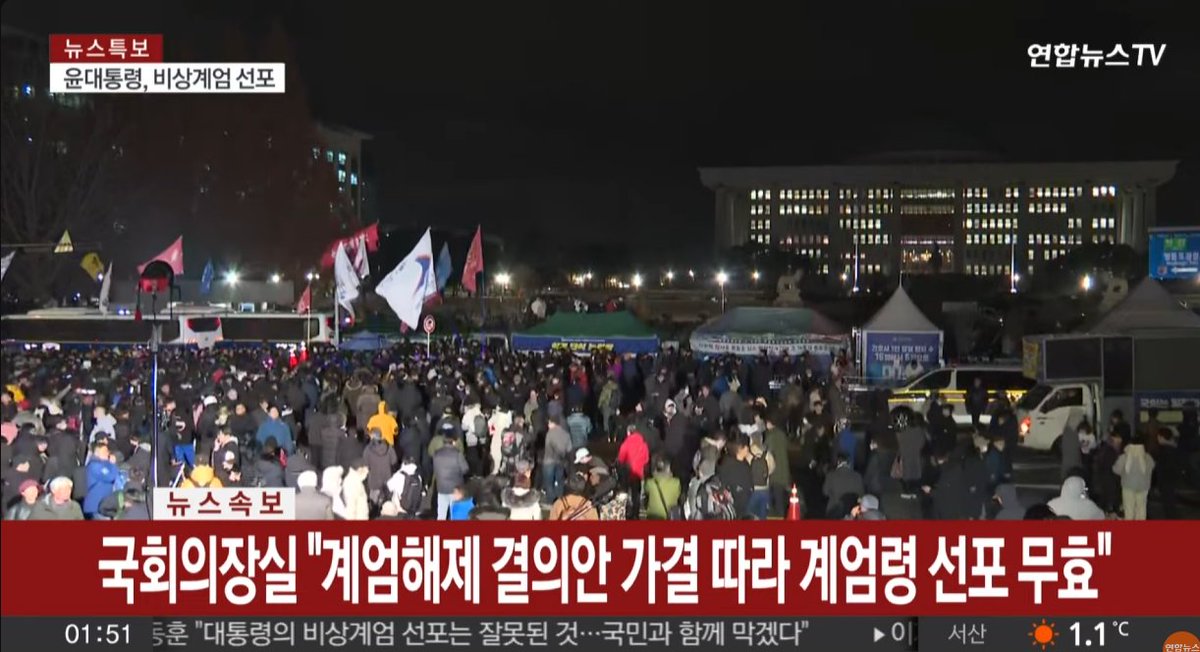 🇰🇷 El líder de la oposición, Lee Jae-Myung, anuncia que la ley marcial ha quedado vacía, inconstitucional e ilegal. Sin embargo, oficiales del ministerio de defensa afirman que la ley marcial sigue en vigor hasta que el presidente dictamine lo contrario.